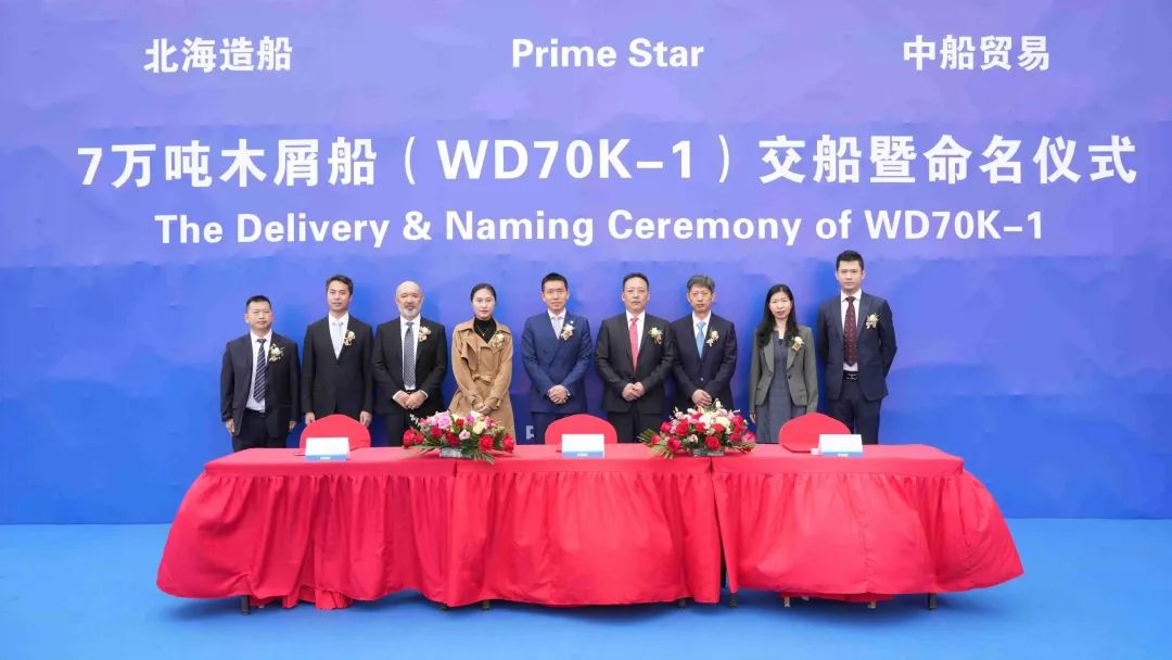 4月28日上午,中國船舶集團青島北海造船有限公司和中國船舶工業貿易有限公司作為聯合賣方,為Prime Star公司建造的7萬噸木屑船首制船在北海造船碼頭命名交付。