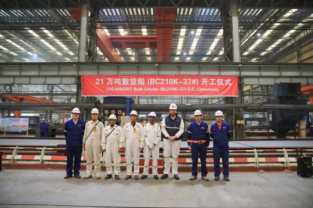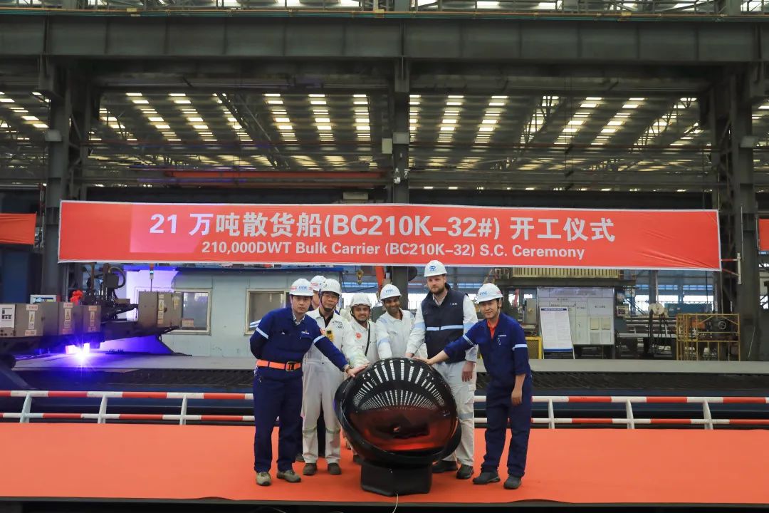 4月28日下午,北海造船CMB項目21萬噸散貨船“氨Ready”系列32號、37號船相繼開工。