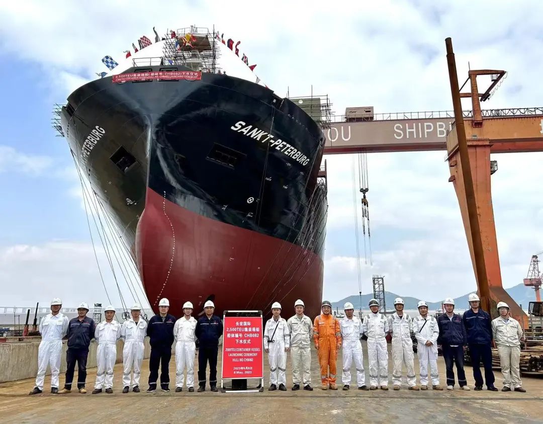 5月8日,長宏國際為上井物流建造的2500箱集裝箱系列船第5艘船(CHB082)在3#斜船臺順利下水。