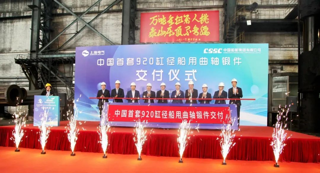 5月12日,首套國產X92大型船用低速機曲軸鍛件交付儀式舉行,上海電氣集團所屬上重鑄鍛有限公司獲得WinGD 缸徑96cm及以下二沖程發動機曲軸鍛件專利認證,上重鑄鍛有限公司向上海船用曲軸有限公司交付首套國產X92大型船用低速機曲軸鍛件。
