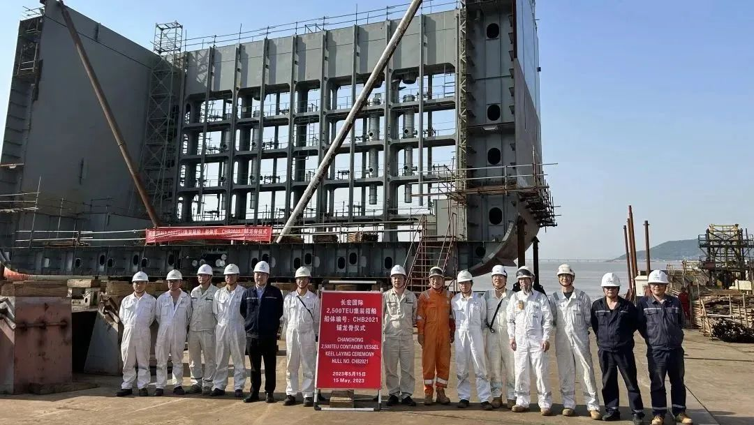 5月15日下午,舟山長宏國際為船東上井物流建造的2500箱集裝箱系列船第7條船(船體編號CHB2021)在長宏3號船順利上船臺,標志著該船正式進入船臺搭載合攏階段。