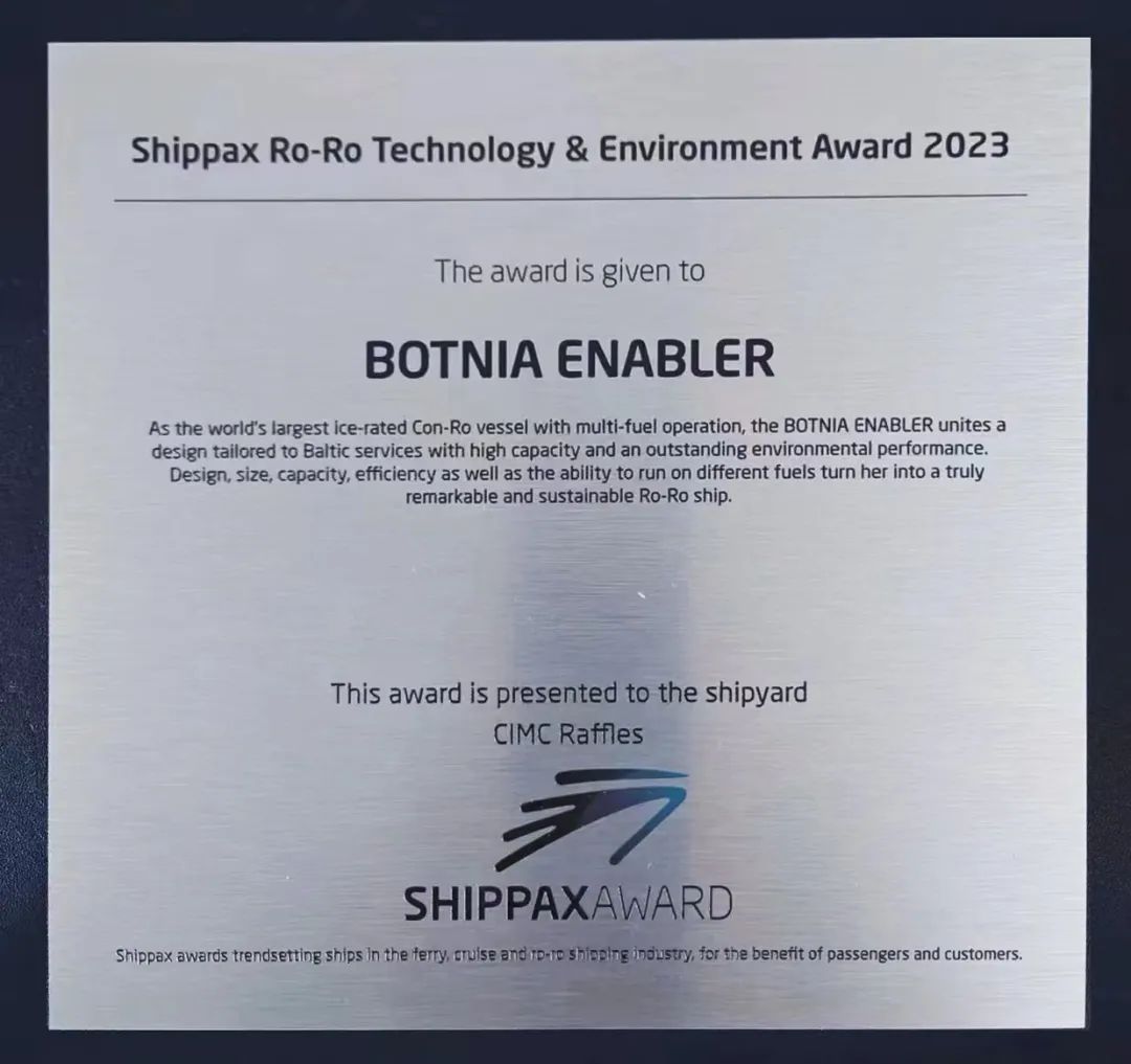 近日,全球滾裝船專業論壇Shippax發布2023年獲獎名單,中集來福士為瑞典航運巨頭WALLENIUS SOL建造的5800米車道雙燃料冰級貨物滾裝船BOTNIA ENABLER榮獲“2023年滾裝船技術與環境獎”,這是中集來福士繼2022年在業界知名渡輪航運峰會Ferry Shipping Summit上被評為“2022年度最佳滾裝船”的榮譽后,再次獲得滾裝船領域的獎項。