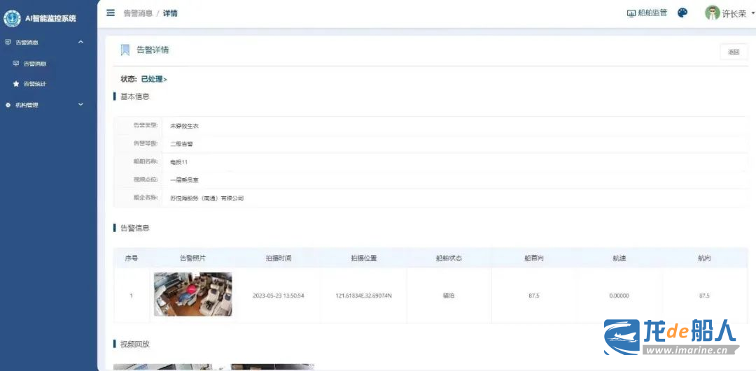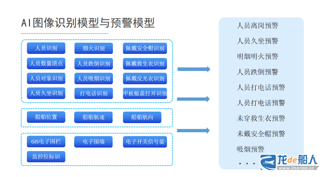 據悉,該AI智能監控系統模塊通過4G鏈路或北斗報文系統連接云服務器,可以基于原船載CCTV監控系統改造,通過對視頻圖像信號的后臺智能判斷實現主動預警。系統預設了明煙明火、未穿救生衣、碰撞告警、人員落水、疲勞駕駛等14個告警模型,同時可對相關模型的參數指標自定義配置。