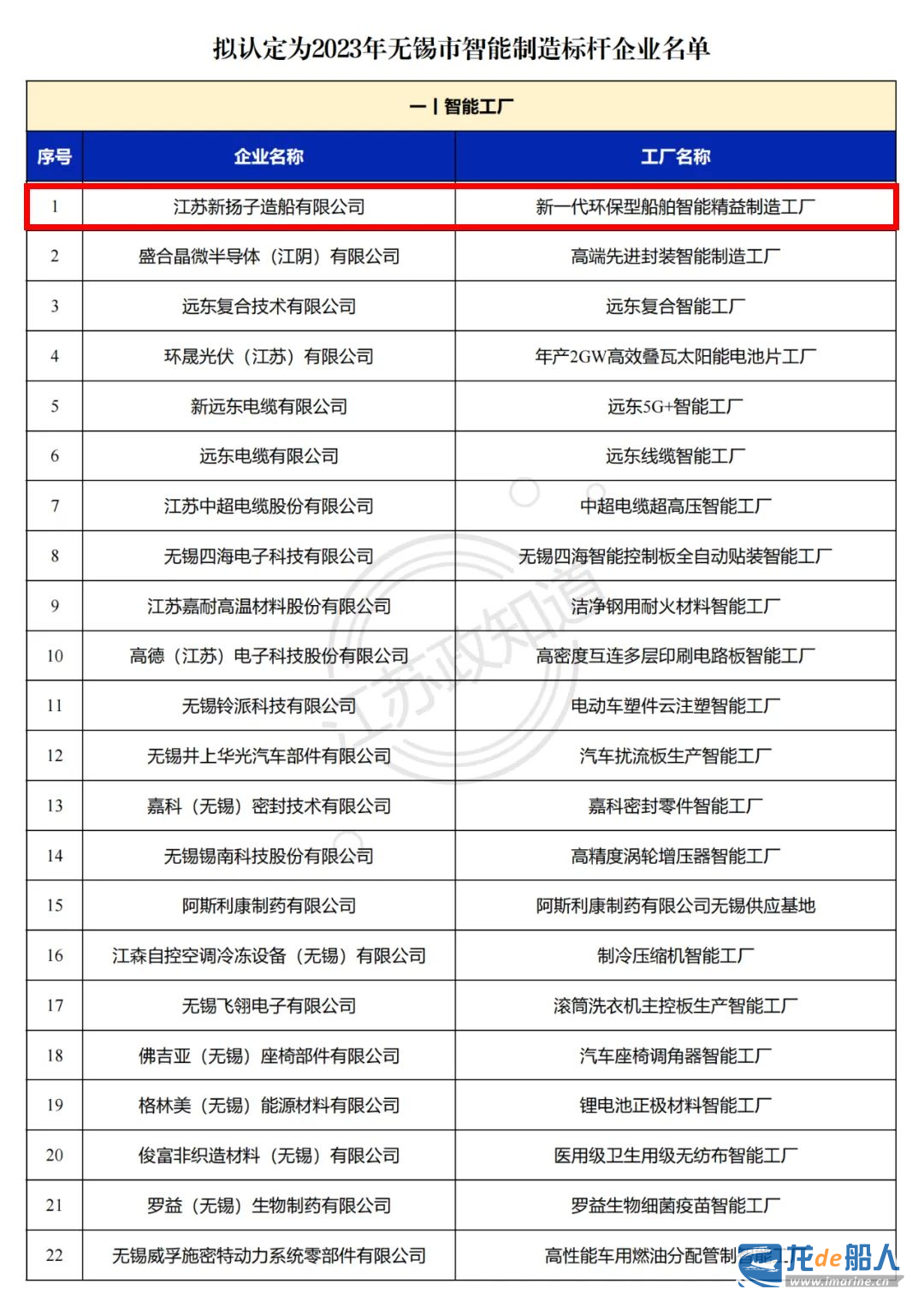 新揚子造船被認定為“2023年無錫市智能制造標桿企業” 來源:龍de船人 2023-06-14 20:13 近日,無錫市工業和信息化局歷經網上公告、單位申報、市(縣)區受理和審核、形式審查、專家評審等程序,確定了一批擬認定的市級智能制造標桿。江蘇新揚子造船有限公司被認定為“2023年無錫市智能制造標桿企業”。 來源:無錫工信