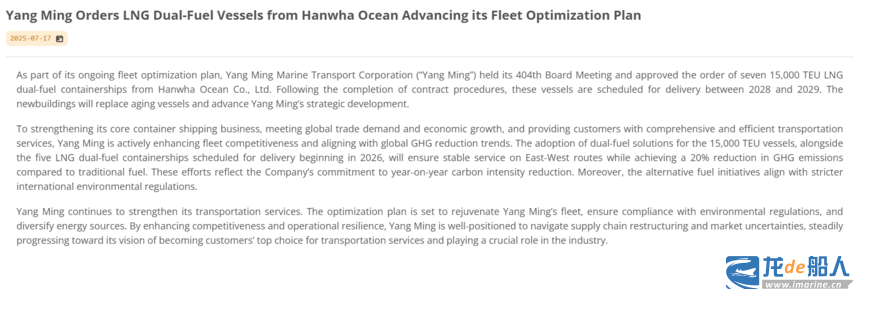 陽明海運在公告中表示:“7艘15500TEU LNG雙燃料動力集裝箱船,加上HD現代重工計劃于2026年交付的5艘15500TEU LNG雙燃料動力集裝箱船,將在確保東西航線穩定運營的同時,與傳統燃料相比,實現溫室氣體排放減少20%。”