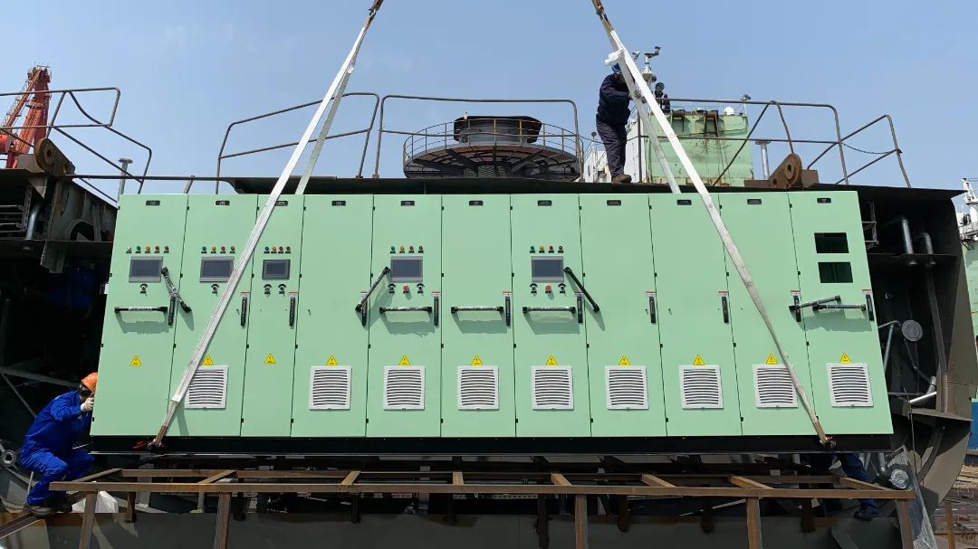近期,備受關注的連云港港口集團有限公司旗下鴻云實業有限公司承建的5400HP純電動拖輪項目最大的設備直流配電板順利進艙。