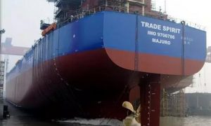 3月14日上午7:30時,廠編23號82000噸散貨船在新揚子船臺順利下水。該船是揚子江船業為希臘MMS船東建造的第五艘82000噸散貨船。