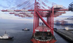 廣州南沙四期自動化碼頭第三批岸橋 10月29日清晨,“振華32”輪裝載的南沙四期自動化集裝箱碼頭一期工程5臺岸橋,駛離長興分公司碼頭前往廣州...