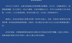 據“活力鐵山港”微信公眾號消息,8月9日上午9時許,北海市營盤派出所接到群眾報警稱,在白龍、古城海域發生一起擺渡船側翻,有人員傷亡。經全力搜...