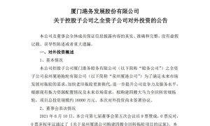 6月10日,廈門港務發展股份有限公司(以下簡稱“廈門港務”)披露了關于《控股子公司之全資子公司對外投資》的公告。 公告稱,廈門港務控股子公司...