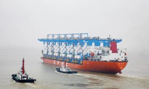 5月23日,“振華32”輪裝載著廣西北部灣欽州港自動化碼頭項目首批6臺自動化軌道吊順利駛離振華重工南通分公司,前往廣西。 “首船發運標志著項...