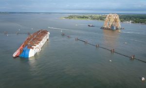 5月14日中午,在美國佐治亞州附近海域,韓國傾覆汽車運輸船“金色光芒”號(Golden Ray)的打撈現場突發大火。 https://v.q...