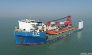 1月中旬,中遠海運特運10萬噸半潛船“新光華”輪在廣州大嶼山錨地順利潛裝“泓邦6號”起重船駛往毛里求斯打撈“Wakashio”號。(詳見 中...