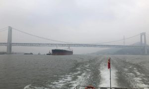 圖為:關員為出口船舶辦理《船舶免予衛生控制措施證書》 馬元鵬/攝 2月3日,在大連港灣海關的監管下,大連中遠海運重工有限公司建造的18000...