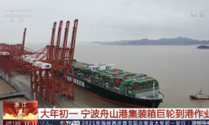 2月12日上午9點50分,浙江寧波舟山港迎來農歷新年的第一艘兩萬標準集裝箱巨輪到港作業。 在寧波舟山港梅山港區,這艘來自馬來西亞的集裝箱輪“...