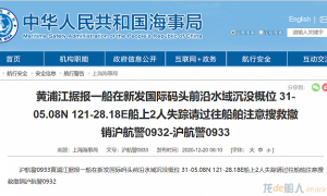 據上海海事局20日消息,黃浦江據報一船在新發國際碼頭前沿水域沉沒,船上2人失蹤,概位31-05.08N 121-28.18E。請過往船舶注意...