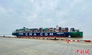 “達飛巴黎皇宮”號高效完成了下水運營后在洋山港的首次裝卸作業任務,緩緩駛離。洋山邊檢站供圖 今年1-11月,上海洋山港集裝箱吞吐量達1840...