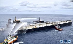 9月6日,在斯里蘭卡以東海域,救援船為"新鉆石"號油輪滅火。 斯里蘭卡海軍發言人德席爾瓦6日在科倫坡告訴新華社記者,“新鉆石”號油輪火勢已得...